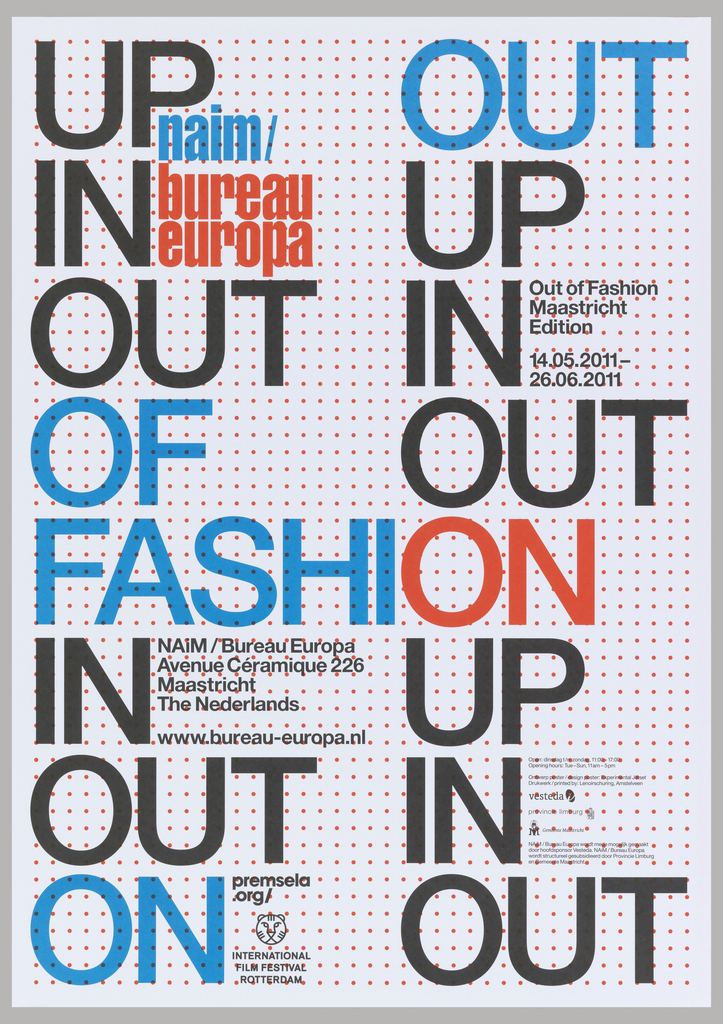 Experimental Jetset designed the graphic identity for the traveling exhibition “Out of Fashion” that originated at the International Film Festival in Rotterdam and was shown at NAiM / Bureau Europa, an architecture institute in Maastricht, Netherlands. The exhibition focused on the relationship between fashion and cinema. For their poster design, the team chose a graphic word play on the phrase Out of Fashion by adding additional or alternate prepositions, including Up, In, On and Of. The designers drew inspiration from the title of the film by William Klein “In and Out of Fashion.” Tying the composition together, Experiemental Jetset generated a layer of dots that recalls both textile patterns and the grainy resolution of film and video screens.