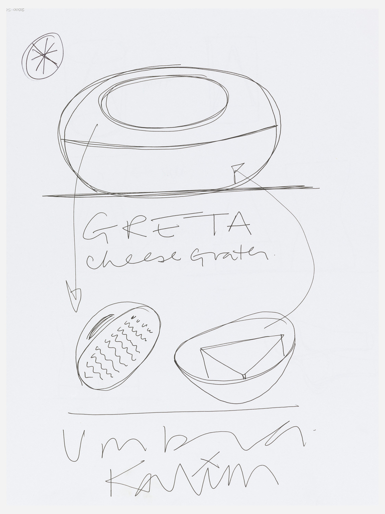 This is a Sketchbook. It was designed by Karim Rashid. It is dated 1998 and we acquired it in 2000. Its medium is ring-bound black cardboard with 17 white paper pages; rollerball pen in black ink. It is a part of the Drawings, Prints, and Graphic Design department.
