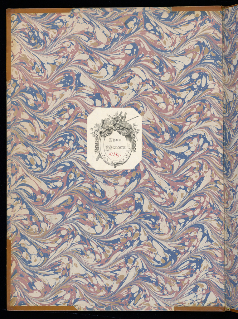 Printed Léon Decloux ex-libris pasted onto center of upper cover pastedown