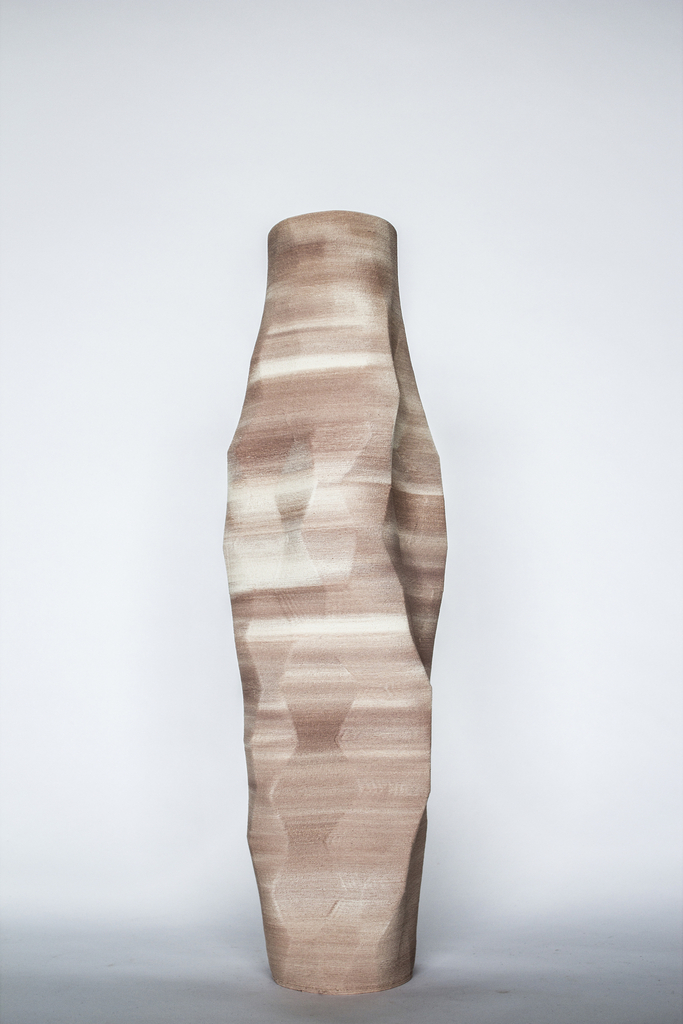 This is a 3D-printed ceramic vessel. It was designed by Olivier van Herpt.