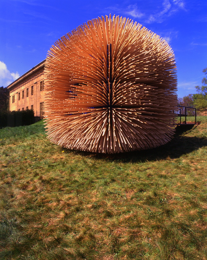 This pavilion is one of twelve temporary sitooteries—a Scottish term for a garden structure in which to ‘sit oot’— commissioned by English Heritage, Britain’s historic preservation agency, for the grounds of Belsay Hall. Long fascinated with the idea of making a hairy building, Heatherwick Studio designed a steel-and-plywood box embedded with wooden rods, or "hairs." The rods function as delicate legs that, together, carry the structure’s weight; they also create a texture that dismantles perceptions of the building’s form, making it look almost blurry. The Sitooterie was on view in summer 1999 and dismantled that autumn.