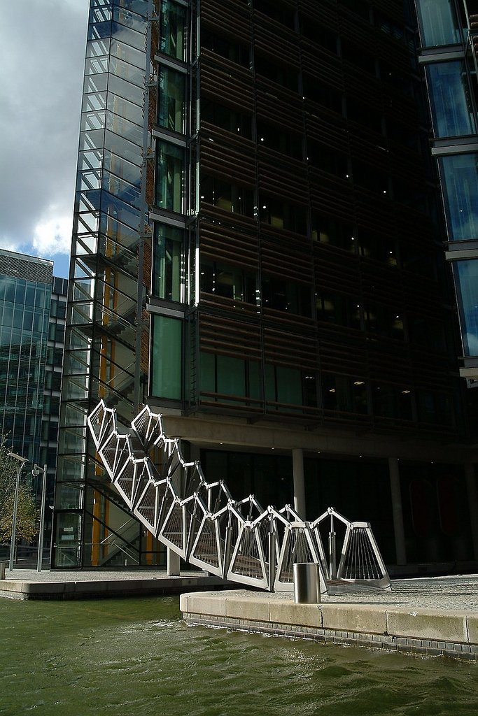 This is a Rolling Bridge. It was designed by Heatherwick Studio and Thomas Heatherwick and made for (as the client) The Paddington Basin Development Corporation, Chelsfield. It is dated 2002–2004. Its medium is painted mild steel, stainless steel cable, wood, aluminum.