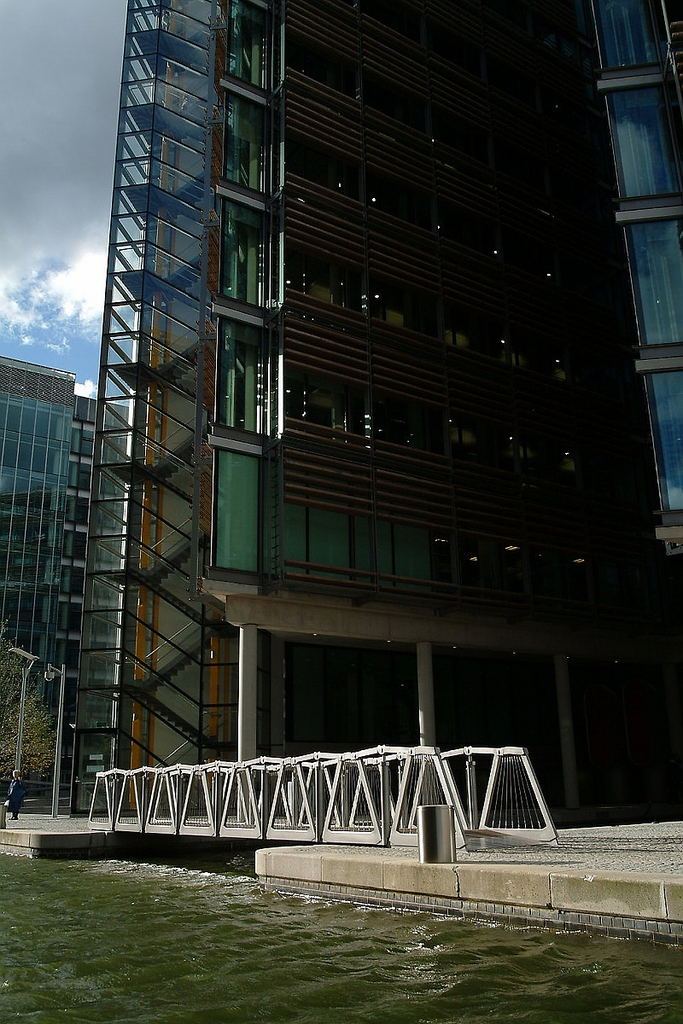 This is a Rolling Bridge. It was designed by Heatherwick Studio and Thomas Heatherwick and made for (as the client) The Paddington Basin Development Corporation, Chelsfield. It is dated 2002–2004. Its medium is painted mild steel, stainless steel cable, wood, aluminum.