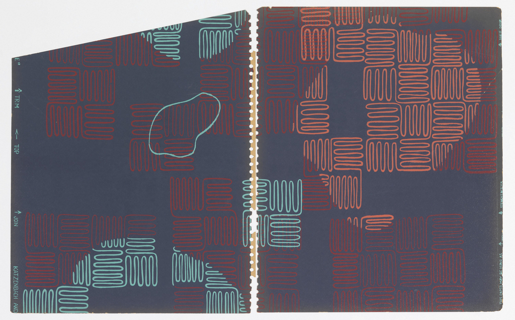 This is a Sidewall - sample. It was made by Katzenbach and Warren, Inc.. It is dated 1948 and we acquired it in 1949. Its medium is screen printed on paper. It is a part of the Wallcoverings department.