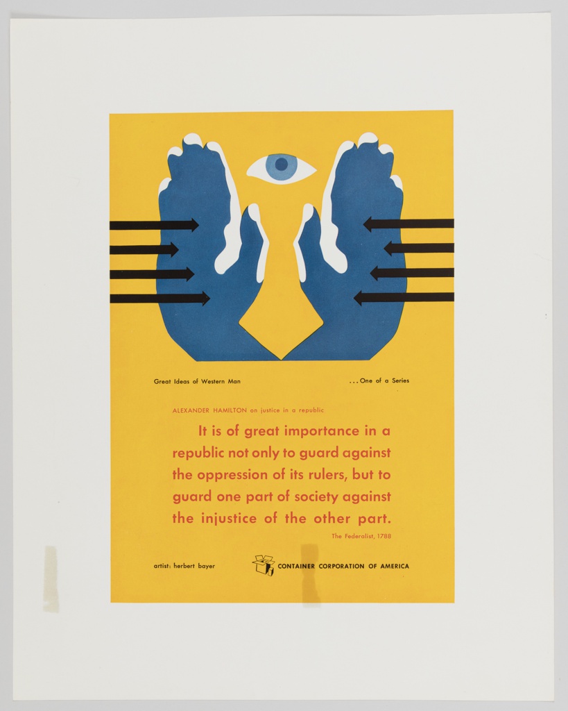 Print, Great Ideas of Western Man Featuring Alexander Hamilton; Designed by Herbert Bayer (American, b. Austria, active Germany and USA, 1900–1985); Client: Container Corporation of America (United States); offset lithograph on glossy white paper; 35.4 × 28 cm (13 15/16 in. × 11 in.); Museum purchase with funding provided by the Buddy Taub Foundation, Dennis A. Roach and Jill Roach Directors; 2016-54-10