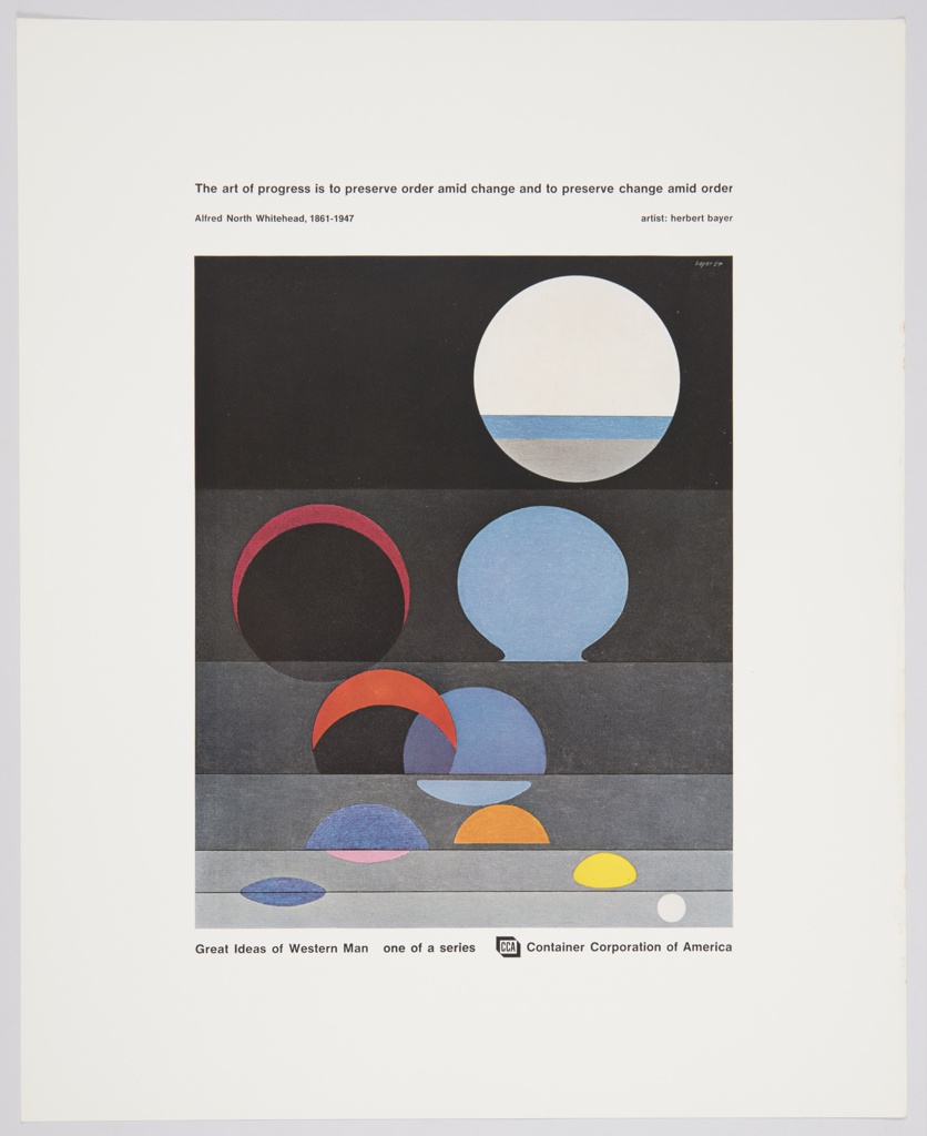 Inscribed in graphite, verso, lower right: Herbert Bayer 1964 CCA great ideas page. Verso also contains a description of Whitehead, Bayer, and comments by Bayer on the artwork featured in the design in grey printed text. Printed in grey ink, verso, bottom: Herbert Bayer's comments on his interpretation are as follows: / "I am symbolizing a progress of events, as a movement forward in time and space, an / onward course, as a progression of two circular forms. / There is order in the progressive intervals in which changes occur. And there is progres- / sive change in the forms as they advance. In this design may be seen the change in form / and color of a waging moon and a rising sun." / Container Corporation of America, May 15, 1964