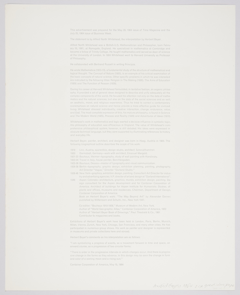Inscribed in graphite, verso, lower right: Herbert Bayer 1964 CCA great ideas page. Verso also contains a description of Whitehead, Bayer, and comments by Bayer on the artwork featured in the design in grey printed text. Printed in grey ink, verso, bottom: Herbert Bayer's comments on his interpretation are as follows: / "I am symbolizing a progress of events, as a movement forward in time and space, an / onward course, as a progression of two circular forms. / There is order in the progressive intervals in which changes occur. And there is progres- / sive change in the forms as they advance. In this design may be seen the change in form / and color of a waging moon and a rising sun." / Container Corporation of America, May 15, 1964